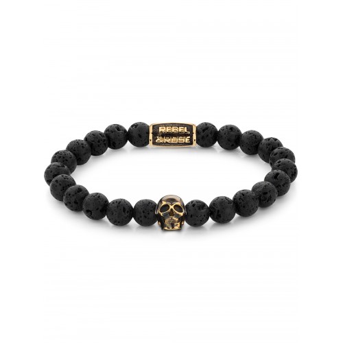 Ši stilinga Rebel & Rose RR-SK002-G-L apyrankė puikiai tinka drąsą vertinantiems vyrams. Pagamintas iš Juodos, Auksinės spalvos Lavos akmens ir Nerūdijančio plieno, šis aksesuaras patrauks bet kurios akies žvilgsnį. Puikiai tinkanti bet kokiai progai, ši apyrankė suteiks vertę Jūsų aprangai.