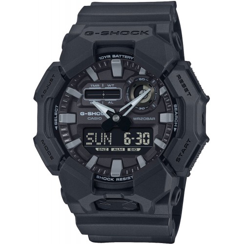 Casio G-Shock GA-010-1A1ER – tai patvarus sportinis laikrodis, sukurtas atlaikyti smūgius, vibracijas ir intensyvų naudojimą. Juodas matinis dizainas su minimalistiniais indeksais ir rodyklėmis suteikia solidumo, o analoginio ir skaitmeninio ciferblato derinys užtikrina patogų laiko skaitymą.
