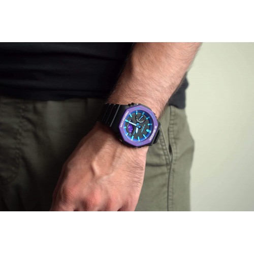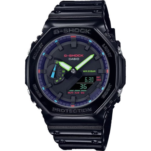 Casio G-SHOCK GA-2100RGB-1AER – tai tvirtas ir stilingas laikrodis, sukurtas tiems, kurie vertina patikimumą ir modernų dizainą. Šis modelis priklauso „Virtual Rainbow“ serijai, kuri sujungia kibernetinės estetikos elementus su G-SHOCK siekiu užtikrinti maksimalų patvarumą.