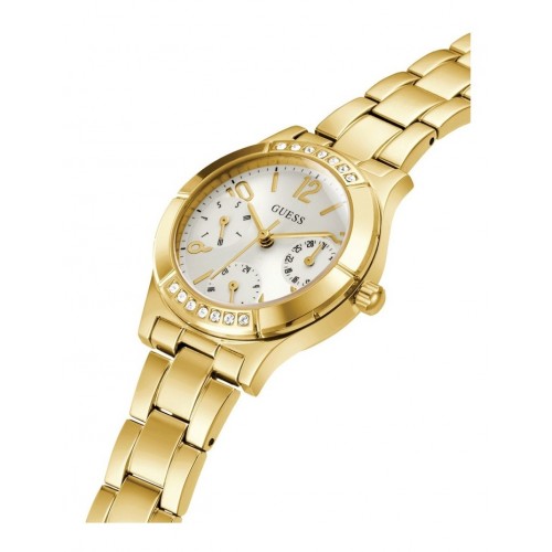 Guess GW0413L2 moteriškas laikrodis puikiai tinka šiuolaikinei damai. Šis laikrodis pagamintas iš nerūdijančio plieno, turi elegantišką aukso spalvos korpusą su kristalų papuošimais. Guess laikrodis turi baterija maitinamą kvarcinį mechanizmą, o poliruota nerūdijančiojo plieno apyrankė užsegama reguliuojama sagtele, kad būtų patogu ir saugu laikrodį nešioti ant riešo. Šis laikrodis puikiai tinka madai neabejingai moteriai, kuri nori klasikinio, laikui nepavaldaus dirbinio.