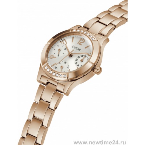 Guess GW0413L3 moteriškas laikrodis puikiai tinka šiuolaikinei damai. Šis laikrodis pagamintas iš nerūdijančio plieno, turi elegantišką rožinio aukso spalvos korpusą su kristalų papuošimais. Guess laikrodis turi baterija maitinamą kvarcinį mechanizmą, o poliruota nerūdijančiojo plieno apyrankė užsegama reguliuojama sagtele, kad būtų patogu ir saugu laikrodį nešioti ant riešo. Šis laikrodis puikiai tinka madai neabejingai moteriai, kuri nori klasikinio, laikui nepavaldaus dirbinio.