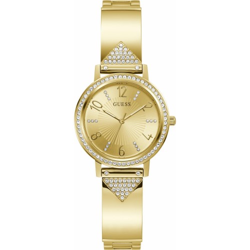 Guess GW0474L2 moteriškas laikrodis puikiai tinka šiuolaikinei damai. Šis laikrodis pagamintas iš nerūdijančio plieno, turi elegantišką aukso spalvos korpusą su kristalų papuošimais. Guess laikrodis turi baterija maitinamą kvarcinį mechanizmą, o poliruota nerūdijančiojo plieno apyrankė užsegama reguliuojama sagtele, kad būtų patogu ir saugu laikrodį nešioti ant riešo. Šis laikrodis puikiai tinka madai neabejingai moteriai, kuri nori klasikinio, laikui nepavaldaus dirbinio.
