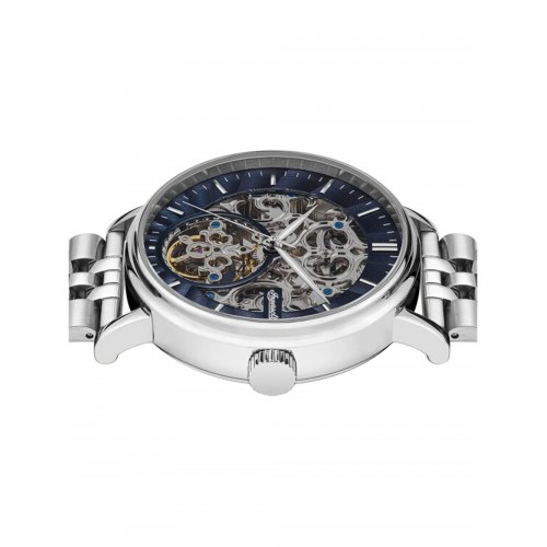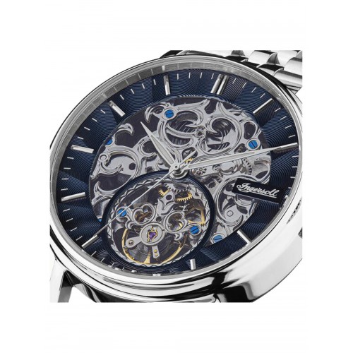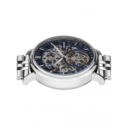 • Ingersoll I05807 turi solidų 44 mm pločio sidabrinį korpusą, kuris dėl poliruoto paviršiaus legvai pritrauks aplinkinių dėmesį. Šio laikrodžio ciferblatas mėlynas su aiškiomis ir lengvai matomomis rodyklėmis o fiksuotas apvadas subtiliai išsiskiria iš korpuso.